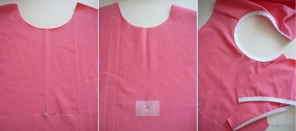 Кроим все необходимые детали футболки. На полочке отмечаем линию середины застежки и ее конец. С изнанке на месте конца приклеиваем кусочек нитепрошивного флизелина шириной чуть больше ширины планки в готовом виде и высотой около 2см.