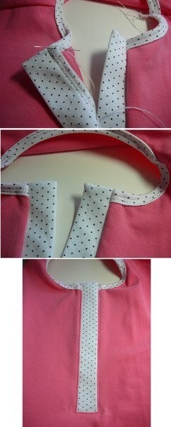 Выполняем правый плечевой шов фуболки. Вырез горловины и низы рукавов обрабатываем косой бейкой. Выполняем левый плечевой шов.
