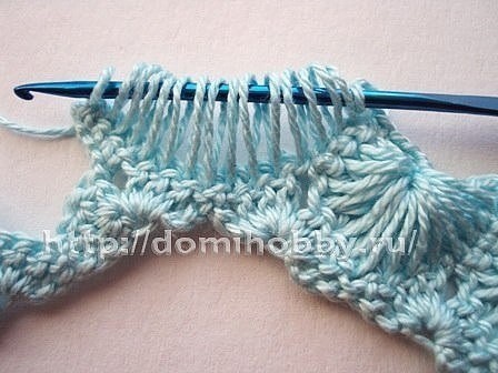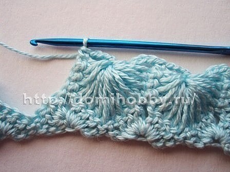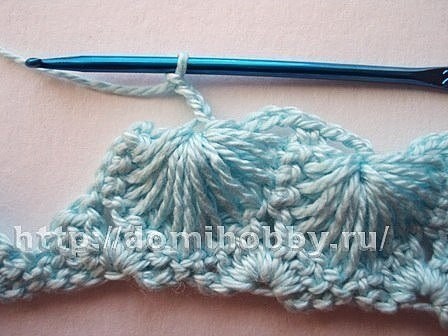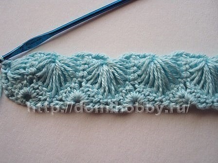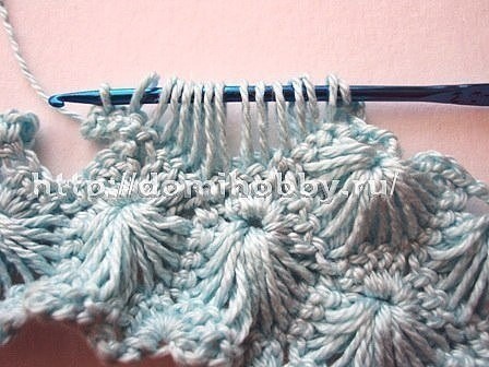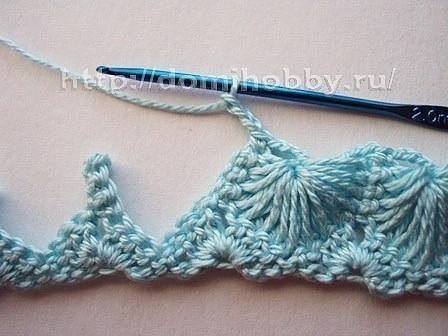 Для начала вязания наберите цепочку из воздушных петель, учитывая, что раппорт узора составляет 8 петель.1-й ряд: сделайте одну воздушную петлю подъема; столбик без накида; *пропустив 3 петли цепочки, в четвертую вяжите 3 столбика с накидом;Далее вяжите цепочку из 5-ти воздушных петель и, пропустив одну петлю от крючка, вяжите 4 столбика без накида по цепочке, образуя некий «шпиль».