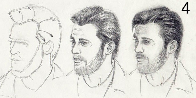 Рисунок 4 показывает рисование мужской прически. Нарисованы контуры, затемнены наиболее темные участки, которые обычно располагаются на висках, проборе и задней части головы, а затем обозначается свет.