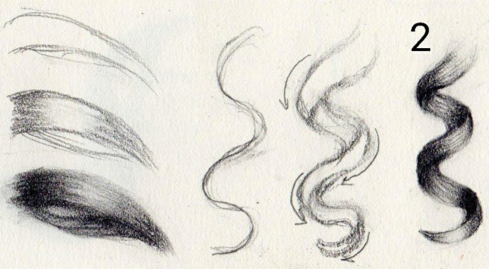 На рисунке 2 справа нарисован вьющийся локон. Для начала лучше определить контуры изгиба и направление волос одной линией. Затем добавить вторую линию, которая добавляет изгибы в логической прогрессии, когда она появляется с одной стороны и исчезает с другой. Стрелочки показывают их общее направление.