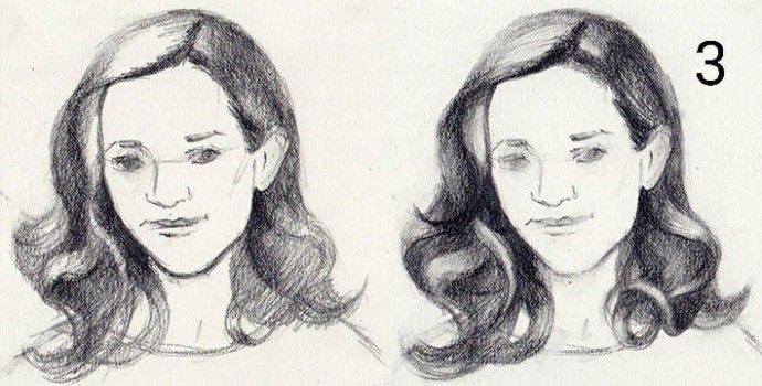 На рисунке 2 слева вы видите локон, который технически состоит из двух линий. Затем были прорисованны наиболее глубокие тени направленными штрихами мягкого графитного карандаша (4В). Присмотритесь к направлению локона. Не накладывайте тени плоскими прямыми линиями вокруг лица – весь рисунок моментально станет плоским.