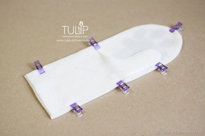 Начнем работу с соединения деталей задней, ладонной стороны варежек. Первым делом необходимо сформировать пальчик. Для этого складываем детали лицевыми сторонами друг к другу, как показано на фото и скрепляем булавками или клипсами. Обратите внимание на метку, ее обязательно нужно с выкройки перенести на материал. Прокладываем строчку. Конец строчки должен быть как раз на метке.