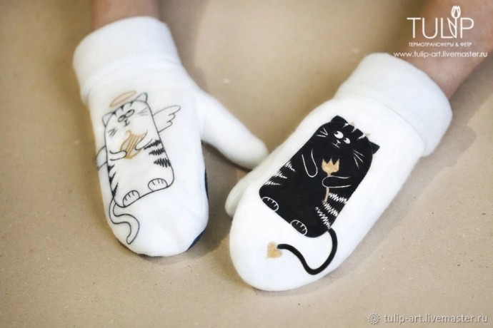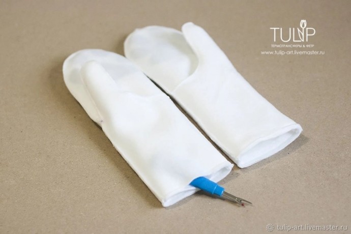 Осталось соединить подкладочную сторону каждой варежки с наружной. Для этого вкладываем внутреннюю варежку во внешнюю (конечно, «лицом» к «лицу»).