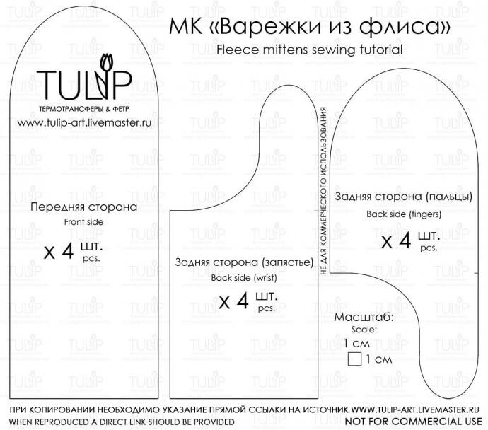 Выкройка дана без припусков, по размеру рассчитана на обычную среднюю женскую руку.
