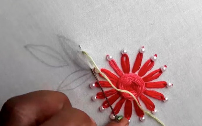 Заводя иглу за соседний луч, накрутите нить у основания.