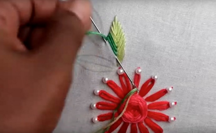 Протяните нить с краю посередине одного из листьев. Проткните иглой основание листа и выведите ее чуть выше первого стежка. Продолжайте подниматься вверх, заполняя листок. Можно использовать двухцветную нить для объемного эффекта.