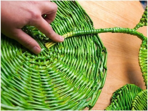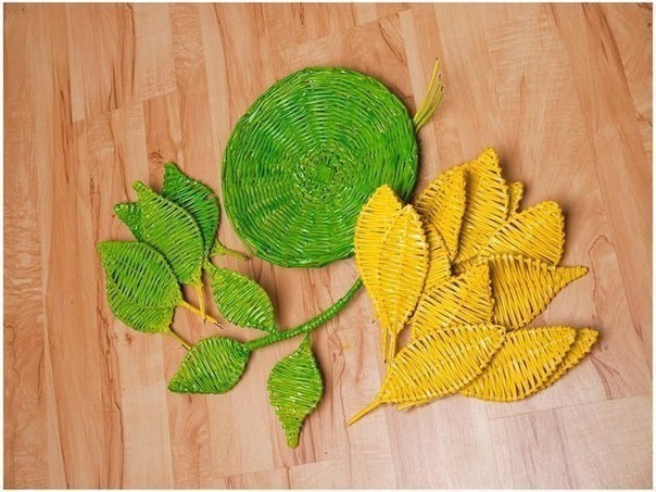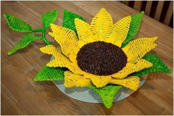 Вазочка в виде подсолнуха изготавливается из газетных трубочек.
