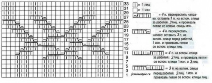 Узор "коса" (на 27 п.): вязать по схеме, на которой приведены только лиц. ряды, в изн. рядах петли вязать по рисунку. С 1-го по 34-й ряд вязать 1 раз.