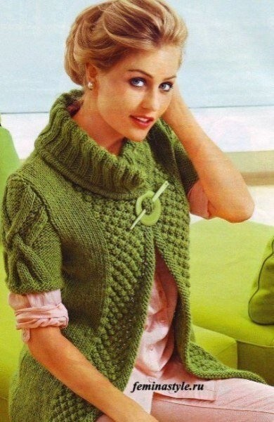 Спинка: набрать 64 (70) 76 п. и связать для планки 2 см = 4 ряда изн. гладью. Затем вязать лиц. гладью. Через 51 (51,5) 52 см от планки с обеих сторон закрыть для проймы 3 петли, в каждом 2-м р. 1 х 2 п. и 3 р. по 1 п. = 48 (54) 60 п. Через 68 (70) 72 см от планки для выреза горловины закрыть центральные 18 (20) 22 п. и обе стороны закончить раздельно. Для закругления горловины на внутренних краях плеч закрыть в следующем 2 р. еще раз 3 п. Через 70 (72) 74 см от нижней планки закрыть оставшиеся по 12 (14) 16 п. плеча. Левая полочка: набрать 36 (39) 42 п. и для планки провязать 2 см изн. гладью. Затем вязать следующим образом: кром. п., 18 (21) 24 п. лиц. гл., 16 п. узор "спящая красавица", кром. п. Пройму выполнить на такой же высоте, как на спинке. Для выреза горловины через 58 (59) 60 см от планки с левого края закрыть 2 п., затем закрыть в каждом 2 р. 6 х по 2 п. и 2 (3) 4 х по 1 п. Оставшиеся 12 (14) 16 п. плеча закрыть на такой же высоте, как на спинке. Правая полочка:вязать симметрично. Рукава: Набрать 36 (40) 44 п. и для планки провязать 2 см изн. гладью, при этом в последнем ряду планки равномерно прибавить 11 п. = 47 (51) 55 п. Затем вязать следующим образом: кром., 9 (11) 13 п. изн. гл., 27 п. узора "коса", 9 (11) 13 п. изн. гл., кром. Одновременно от планки прибавить для скосов рукава с обеих сторон в каждом 2-м р. 3 х 1 изн. п. = 53 (57) 61 п. Через 4,5 см от планки закрыть для оката рукава с обеих сторон 3 п., затем в каждом 2-м р. закрыть 1 х 2 п., 8 х 1 п., 2 х 2 п. и 1 х 4 п. Через 19 см от планки закрыть оставшиеся 11 (15) 19 п., Сборка деталей жилета: Для планок полочек по прямым краям полочек набрать 76 (77) 78 п. и провязать 4 ряда изн. гладью, в следующем изн.ряду закрыть все петли изн. Выполнить плечевые швы. На круговые спицы набрать по вырезу горловины, включая короткие стороны полочек, 96 (104) 112 п. и вязать между кромочными 4,5 см = 8 р. лиц. гладью. Затем для складки провязать по 1 п. с соответствующей петлей 1-го ряда вместе лицевой. Для этого с изн. стороны работы ввести спицу в соответсвующую п. на 8 рядов ниже, вытянуть изн. петлю и провязать вместе лиц. Для воротника между кромочными продолжить вязать резинкой. На высоте воротника 20 см = 36 р. все петли закрыть по рисунку. Половину воротника вывернуть наружу и сшить короткие края. Затем воротник отвернуть и окантовку воротника подшить вовнутрь. Выполнить боковые швы и швы рукавов.