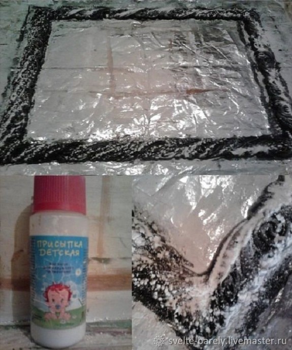 Не дожидаясь высыхания черного цвета присыпаем раму детской присыпкой.