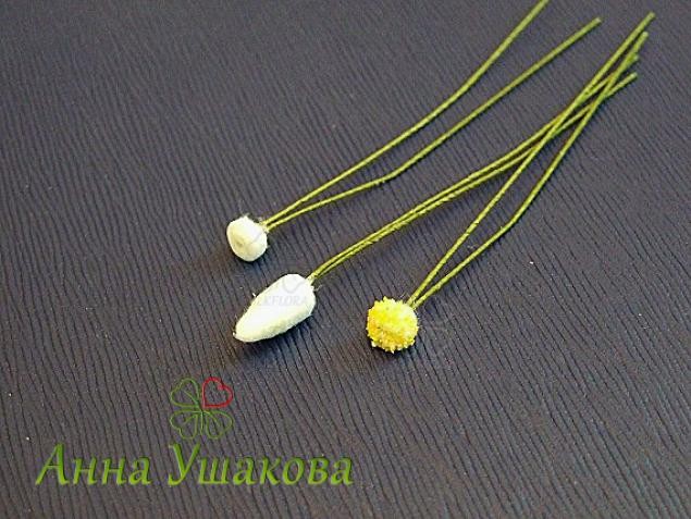 7. Возьмите три кусочка проволоки обмотаной гофрированной бумагой, сложите их пополам и на вершине намотайте шишечки из ваты. Две шишечки (для цветов) приплюснутой формы диаметром 6-8 мм и выстотой 3-4 мм. И одну шишечку (для бутона) в виде конуса высотой 1, 5 см и шириной основания 7 мм.