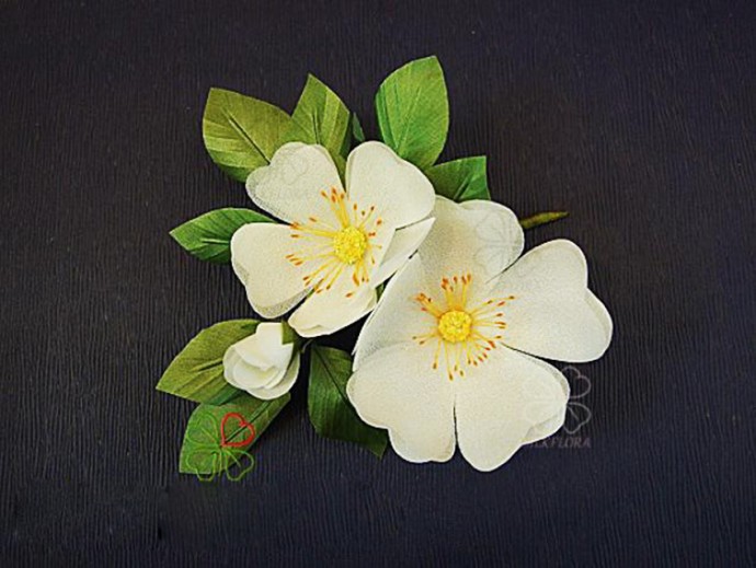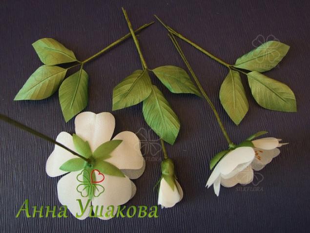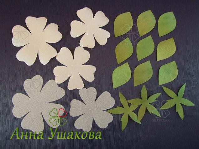 1. Простым карандашом переведите на белый шелк выкройки цветов и вырежьте их так, чтобы контур карандаша остался снаружи, а сами лепестки остались чистыми. Из зеленого атласа по косой вырежьте листочки и подклейки (чашелистики).