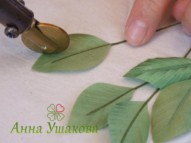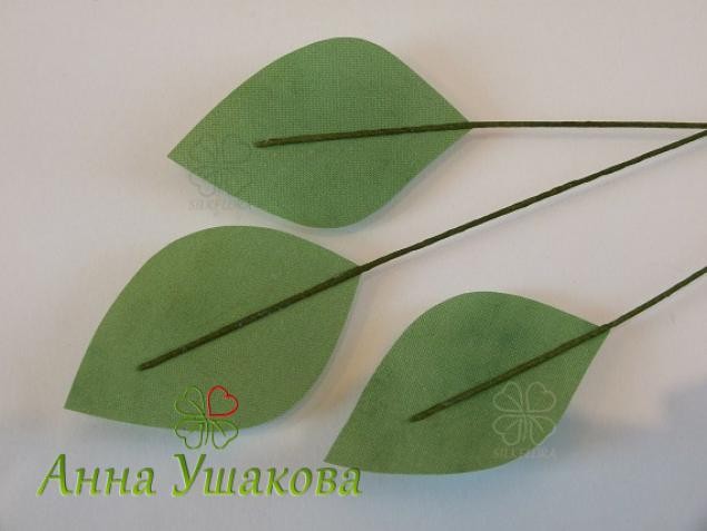 2. К листочкам с изнаночной стороны густым клеем ПВА подклейте летоны (проволока диаметром 0,3 - 0,5 мм обмотанная зеленой гофрированной бумагой).
