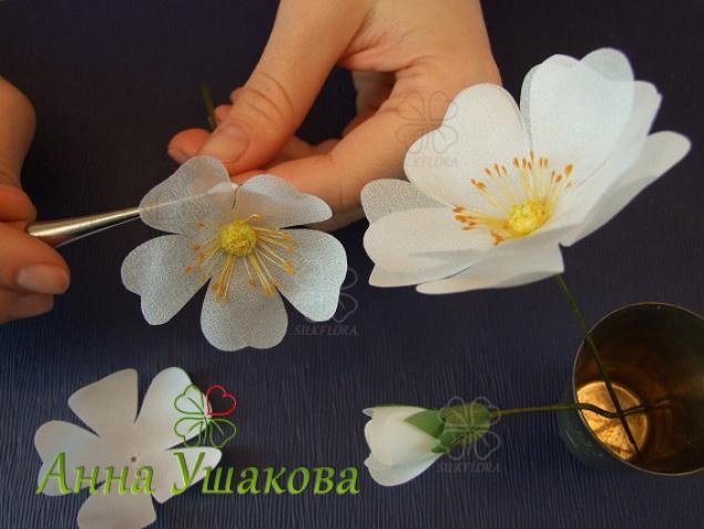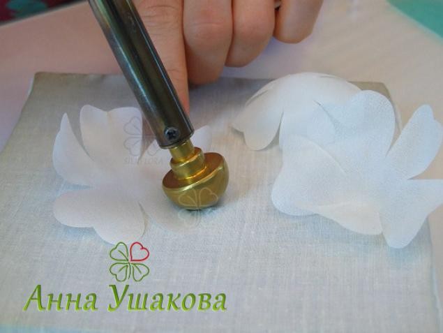 10. В центре лепестковых кругов шилом или ножницами сделайте дырочки. смажьте основания цветочков снизу густым клеем ПВА и подклейте лепестки из шифона, а под них (лепесток под лепесток, а не в шахматном порядке) подклейте лепестки из крепдешина.
