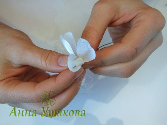 9. В маленьком лепестковом круге из крепдешина сделайте дырочку в центре. Смажьте шишечку для бутона густым клеем ПВА, оденьте на ножку лепестковый круг и сформируйте бутон. Первый лепесток нужно обернуть вокруг шишечки очень плотно, так, чтобы не было видно ватного основания. Остальные лепестки подклейте вокруг первого лепестка.