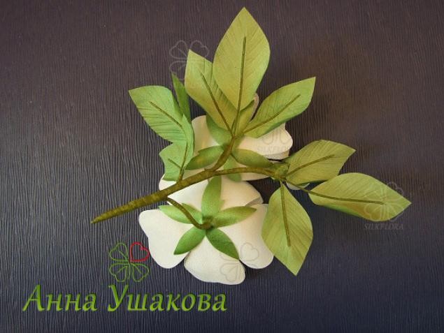 13. Соберите из цветочков, бутона и листьев вот такую веточку. Сначала соедините между собой бутон и первую веточку и обмотайте гофрированной бумагой. Потом присоедините к ним маленький цветочек и вторую веточку листьев и обмотайте гофрированной бумагой, затем присоедините большой цветок и третью веточку. Обрежьте стволик до нужной длины, обмотайте его полоской гофрированной бумаги и смажьте бумагу жидким клеем ПВА.