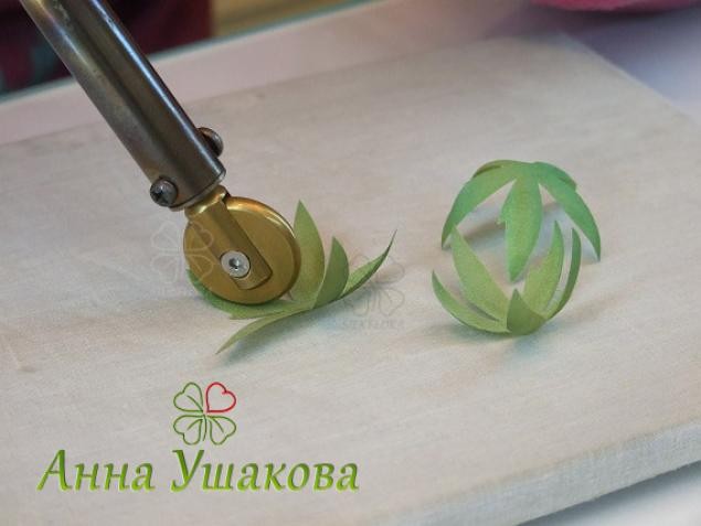 5. Широкой пяточкой на резиновой подушке средней жесткости обработайте подклейки (чашелистики) с изнаночной стороны, движением от себя, от внешнего края листочка к центру.