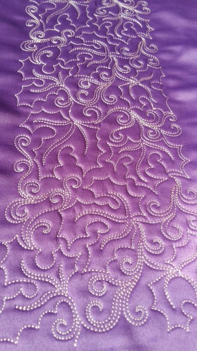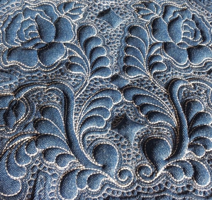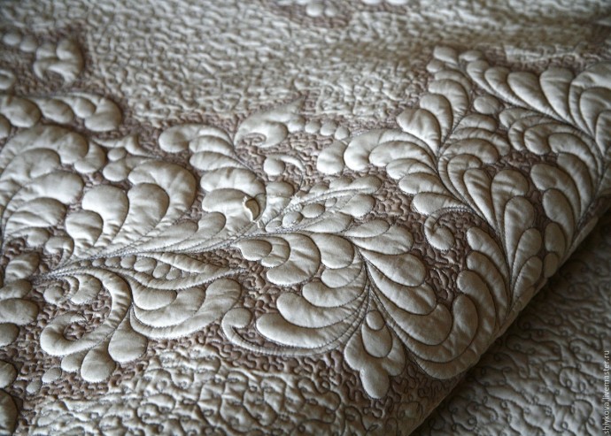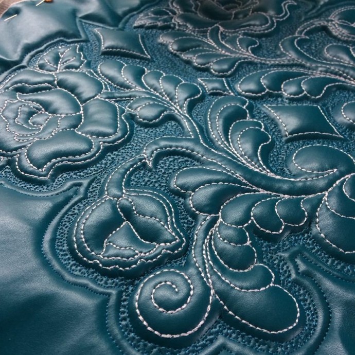 Художественная стежка это вышивка на швейной (или специализированной – стегальной) машине, которая выполняется сразу на трех слоях ткани (лицевая ткань – синтепон – изнаночная ткань), благодаря чему на лицевой поверхности изделия получается объёмный рельефный рисунок. При этом ткань под лапкой двигается руками в направлении, заданном рисунком.