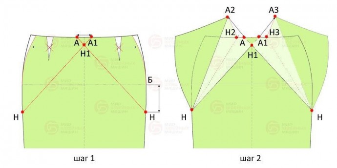 Соедините точки НА1 и НА, на месте их пересечения будет точка Н1. Теперь нужно закрыть вытачки, переведя их в боковые швы.