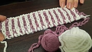 Набрать нечетное количество петель 1-й ряд синяя нить: кромочная, * 1 петлю снять с накидом, как изн., 1 лиц.; повторять от *, закончить: 1 петлю снять с накидом, как изнаночную, кромочная. Работу не поворачивать!