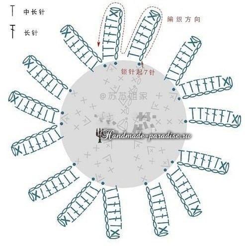 Вязаные ромашкиКаждый ряд заканчиваем соединительной петлей.1ряд: Набираем цепочку из 6в.п. и соединяем в кольцо. Под кольцо провязываем 8Сбн.2ряд: Далее вывязываем лепестки: набир...
