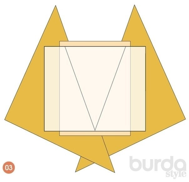 Для ушей сложите оба квадрата размером 5 х 5 см лицевой стороной вовнутрь по диагонали, одну сторону сострочите, верхний угол срежьте. Выверните деталь на лицевую сторону и отутюжьте. Так же сделайте второе ухо.