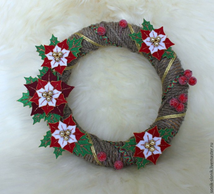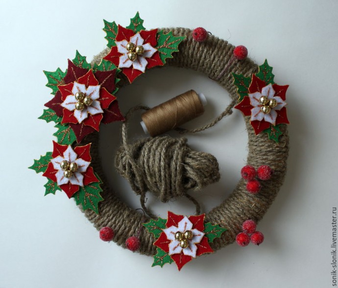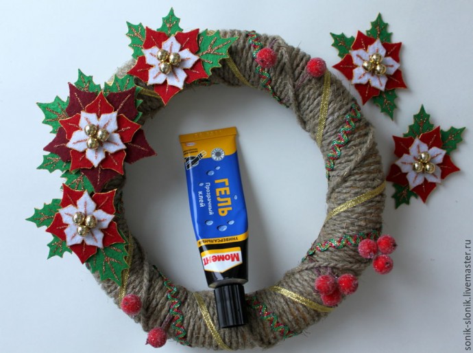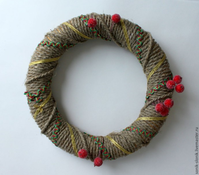 Привязываем ягоды на венок нитками в тон шнура (или приклеиваем клеем, если вам так удобнее), а затем ещё раз обматываем льняным шнуром для лучшего закрепления