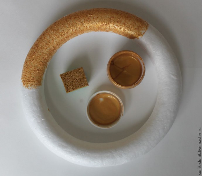 Покрываем пенопластовую заготовку акрилом с двух сторон двойным слоем (шнур будет наматываться в один слой и через него будет просвечивать наше золотое покрытие)