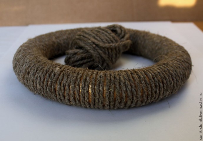 Когда пенопластовая основа высохла, приступаем к обмотке. Закрепляем конец шнура горячим клеем (клей момент разъедает пенопласт) и стараемся обматывать с равными промежутками