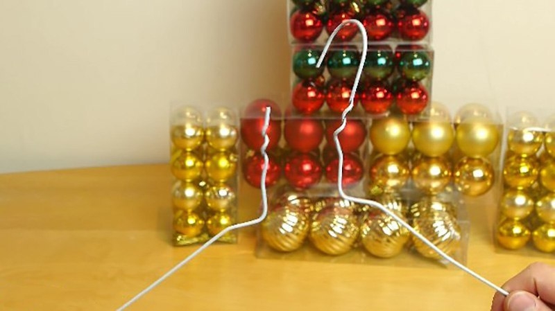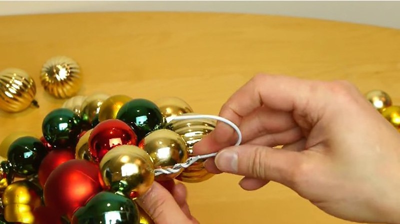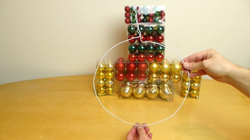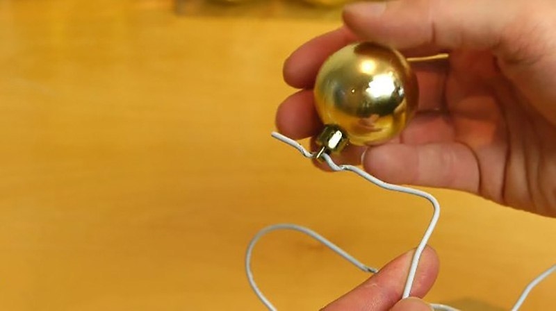 Нанизывай елочные шары на проволоку. Лучше использовать игрушки разной формы и цвета — так получается гораздо интереснее. Не обязательно брать новые шары, можно покрасить аэрозольной краской старые.