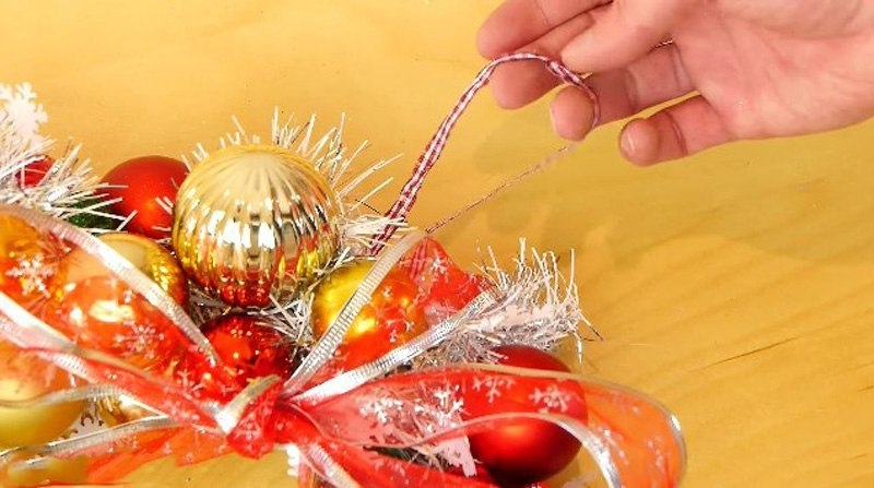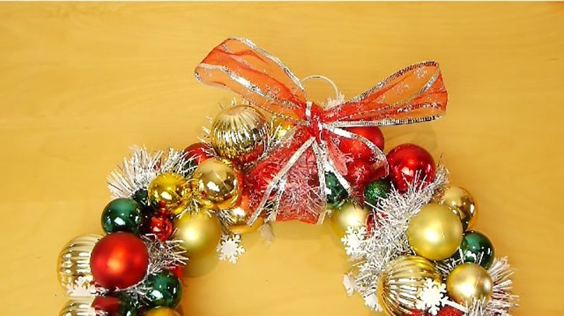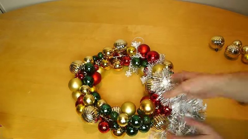 Теперь приступайте к декорированию венка. Можете обмотать его дождиком или хвойными ветками.