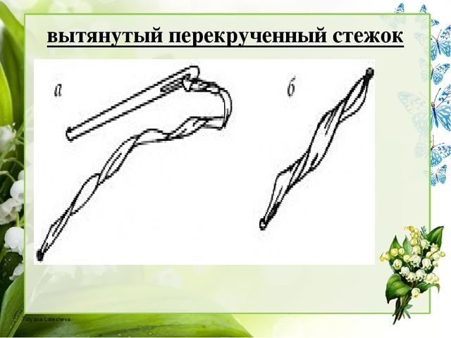 Далее эту скрученную ленту вытягиваем до конца нарисованного стебля, потом в ходе работы ниточками будем пришивать стебелек по контуру правильно, где нужно изогнуть или повернуть, все это мы создаём в процессе зелёными нитками.