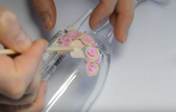 Протираем бокал спиртовой жидкостью, чтобы убрать с него жир, который может препятствовать закреплению цветов на стекле. Ждем пару минут, чтобы бокал подсох, и начинаем декорировать его. Розы приклеиваются на суперклей, а листья – на жидкий пластик.