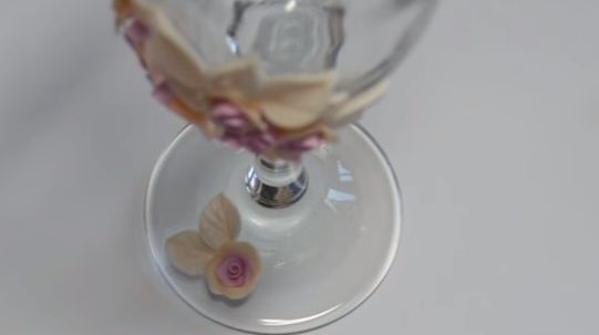 После того, как все элементы нанесены на основную часть бокала, ставим его запекаться на 5 минут. При этом бокал в духовой шкаф нужно установить в положении лежа на боку, чтобы не сместились элементы декора. Далее переходим к декорированию ножки, после чего также ставим бокал на 5 минут в духовку, но в этот раз стоя.