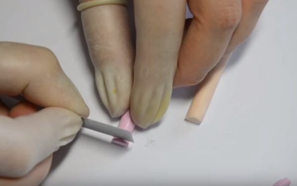 Дополнительно формируем бутоны. Для этого также нарезаем полимерную глину на кружки и каждый из них расплющиваем пальцами и скатываем в валик. Каждый валик разрезаем на две части.