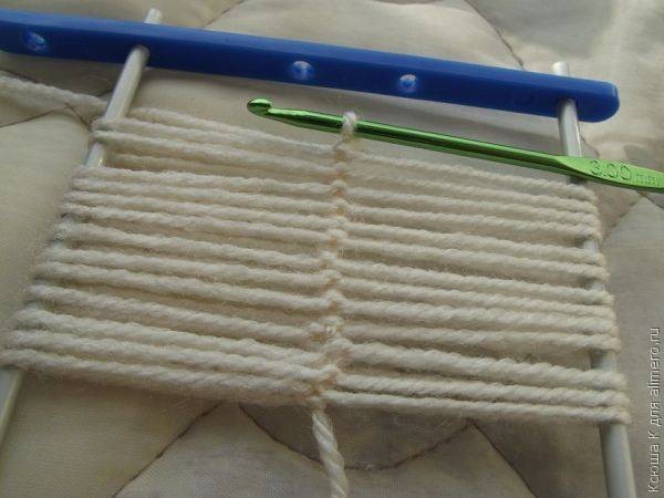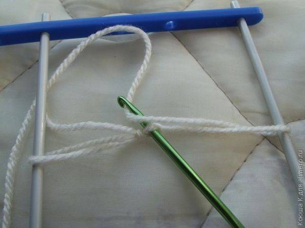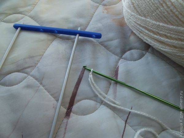 В качестве оборудования используется двузубая вилка, крючок и пряжа.