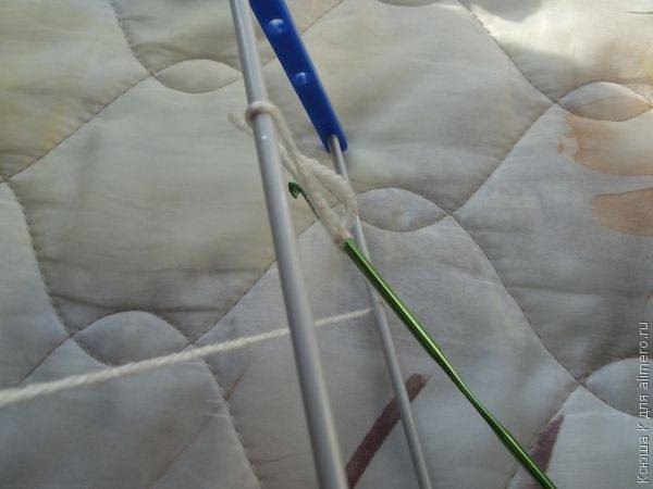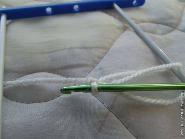 Прокручиваем крючок и вилку таким образом, чтобы закрепить петлю и обернуть спицы нитью.
