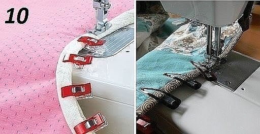 Спасибо за хорошие идеи. Единственно не соглашусь с номером 10: дело в том, что скреплять булавками удобнее, если их вкалывать перпендикулярно предполагаемой строчке, можно строчить не вытаскивая булавки, иголка машинки сама соскальзывает с иглы. А заколки придется всё время вытаскивать.