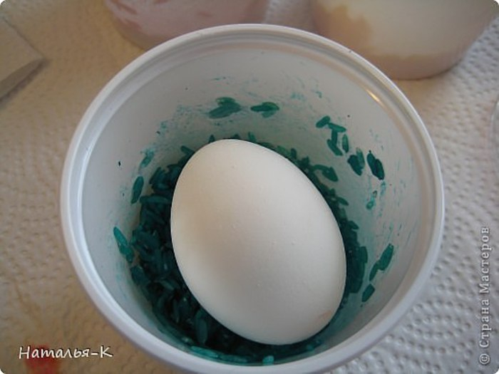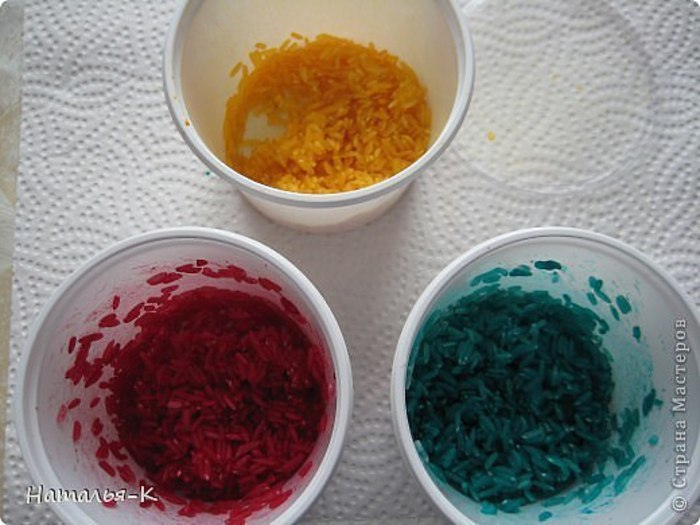 Идея очень непрактична. Рис относительно недешевый продукт, красить нужно разными красками, значит в разные емкости по горсти риса плюс краска.Дорогие яйца выйдут! А потом все это выбрасить надо...