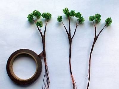 2. Постепенно начинаем сборку бисерного бонсая своими руками. Из сделанных пучков соедините маленькие веточки по 1-2-3-4-5 пучков, обмотайте их флористической лентой.