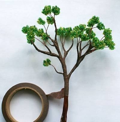 7. Осталось окончательно собрать дерево из бисера своими руками. Возьмите центральную ветку и, прикладывая к ней ветки, выберите нужную. Так по очереди примотайте остальные ветки. Не забывайте утолщать ствол с помощью малярного скотча! Дерево из бисера готово! Осталось его посадить в горшок.