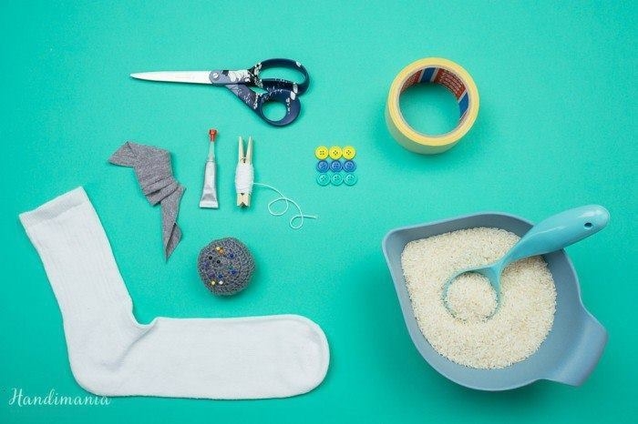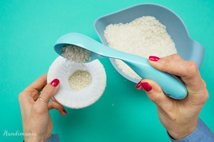 4. Наполните получившийся мешочек рисом. Не жалейте рис; красиво, когда снеговик пухленький.