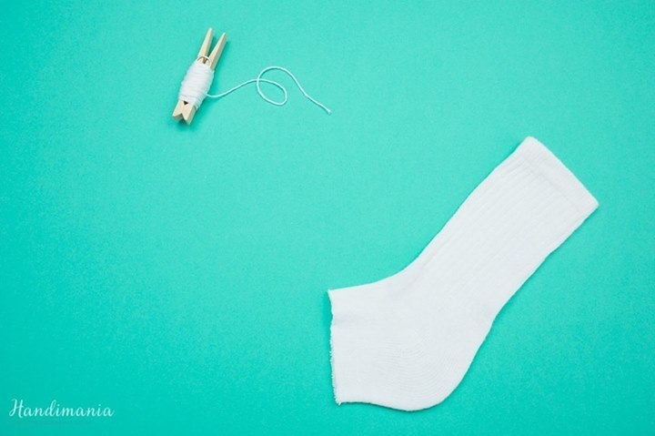 Обращаем ваше внимание на то, что носок должен быть с длинной верхней частью, ведь именно из нее вы будете делать самого снеговика. Из нижней части носка получится шапочка для снеговика.