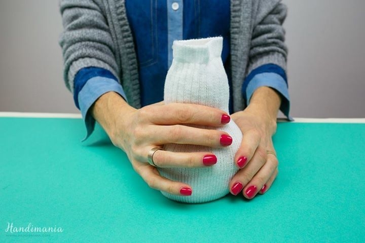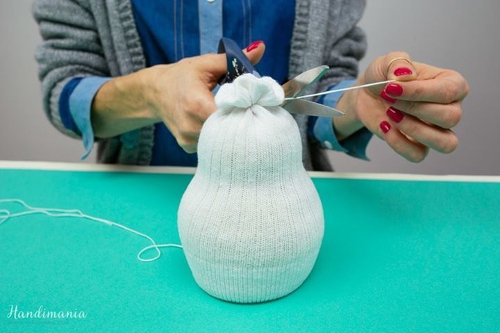 6. Сформируйте голову и перевяжите носок еще раз ниткой в том месте, где у снеговика как бы шея.
