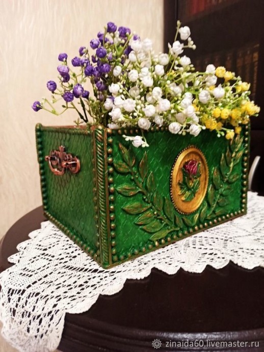 Декор деревянного ящика Автор Амета Декор. Когда мне в руки попадают деревянные коробки, я стараюсь превратить их в полезные вещи для хранения. В этот раз мне принесли ящик из тонкой фанеры. На первый взгляд, он кажется совершенно ненужным, и непонятно, как его можно использовать. К тому же, в некоторых местах фанеру повело, особенно сильно пострадала крышка. Однако, поразмыслив, я решила, что можно оформить только сам ящик. Для переделки понадобится: ящик, пластиковая крышка от сыра, шпатлевка по дерев...