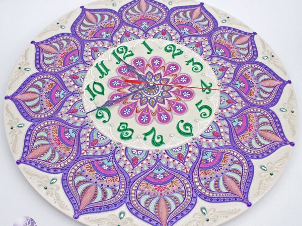 Расписываем интерьерные часы в смешанной технике: часть 7 Основная работа закончена, осталось, на мой взгляд, самое «вкусное» — оживка узора всякими там точечками, цветочечками и закорючечками. Одним словом — чтоб было красиво! Берем тюбики с контурными красками, иголочку (для растягивания капелек краски) или тоненькое шило — у кого что есть, включаем любимую музыку, и — понеслась душа в Рай! Я, пожалуй, не буду заострять внимание на данном процессе, т.к. фантазия у нас всех &mdash...
