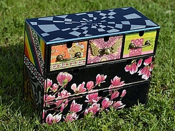 Комод А-ля Хоффман: часть 5 Комод А-ля Хоффман: часть 5 Автор Светлана Ридзель. По центру вертикальная полоска орнамента черного цвета. Так как декор задней стенки полностью окончен, в качестве финишной лакировки я использовала желеобразный гель-лак. Он мне подходил т.к. не являлся водным лаком (что важно для покрытия потали), гель-лак обладает высокой износостойкостью и прекрасно без полос наносится даже на вертикальные поверхности. Мне понравилось с ним работать. На задней стенке три слоя. Единственный минус, который я отметила ... Добавить в закладкиНазначить теги Комод А-ля Хоффман: часть 4 Комод А-ля Хоффман: часть 4 Автор Светлана Ридзель. На крышке по линейке от центра чертим прямые линии на разном расстоянии друг от друга. Затем чертим круги. Я просто обводила разные предметы: скотч двухсторонний, скотч обычный, блюдце, тарелка суповая, тарелка плоская, блюдо побольше и т.д. Сегменты через один закрашиваем маркером. Сегменты можно делать разной длины, не обязательно в шахматном порядке, так смотрится даже интереснее. Заканчиваем с черным фоном на лицевых фасадах. Все фасады и в... Добавить в закладкиНазначить теги Комод А-ля Хоффман: часть 3 Комод А-ля Хоффман: часть 3 Автор Светлана Ридзель. Теперь очередь за верхней частью комода. По задумке на крышке должен располагаться черно-белый узор. Вместо белого я решила использовать более нарядный серебряный цвет, который получила с помощью серебряной потали. Для серебрения покрываем загрунтованную поверхность тонким слоем клея для потали. У меня водный клей Мордан. Через 30 минут (а можно и позже, клей активен до 12 часов) наносим поталь, разглаживаем мягкой кистью, лишнее снимаем жесткой шетинн... Добавить в закладкиНазначить теги Комод А-ля Хоффман: часть 2 Комод А-ля Хоффман: часть 2 Автор Светлана Ридзель. Не дожидаясь высыхания, ножом для бумаги прорезаем салфетку между ящиками и корпусом. В этом комоде интересно то, что мотив остается не только на ящиках, но и заходит на ребра корпуса, это смотрится оригинально и не избито. Проходимся клеем для декупажа поверх салфетки и сушим оклеенную поверхность. Наклеиваем три выбранных салфеточный узора на фасады маленьких ящиков, оставляем до полного высыхания. По периметру фасадов и вдоль оклеенных ребер корпу... Добавить в закладкиНазначить теги Комод А-ля Хоффман: часть 1 Комод А-ля Хоффман: часть 1 Автор Светлана Ридзель. Сегодня будем декорировать обычный Икеевский комод. Сказать по правде, никаких особенных техник и приемов не будет, все просто и легко. Единственное ,что вам потребуется — это терпение и аккуратность. Этот комод задумывался в ярком и экстравагантном стиле немецкого дизайнера Хоффмана. Другой орнамент, другие цвета, но общее настроение, смешение цветов — Хоффманское. Результатом я довольна, иметь дома такую необычную вещь заманчиво и привл... Добавить в закладкиНазначить теги Идеи росписи фарфора Идеи росписи фарфора Как образцы приведены примеры авторского фарфора Анастасии Дрезгуновой. Добавить в закладкиНазначить теги Роспись по камню Роспись по камню Она начинается с выбора подходящего «холста»: гладкого, плоского речного или декоративного камня без трещин и крупных раковин. Прежде чем переходить к живописи, поверхность тщательно моют тёплой водой с мягким мылом, затем удаляют остатки влаги и дают камню полностью
