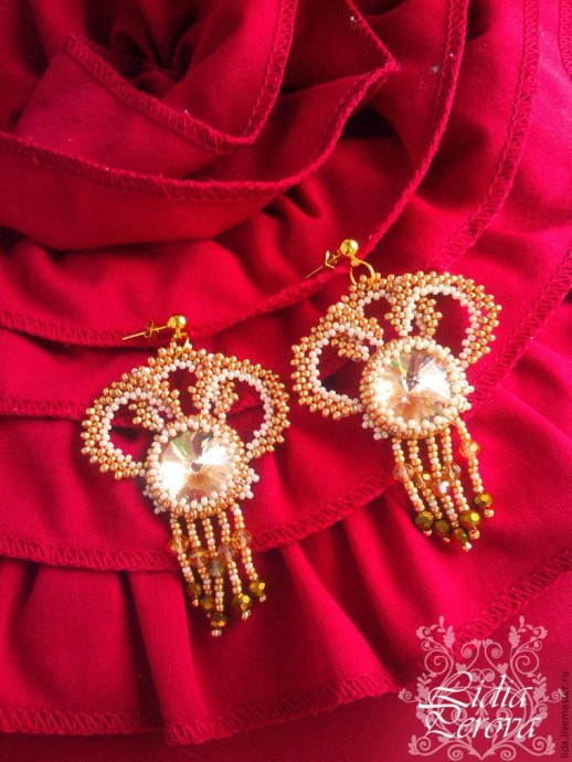 Создаем воздушные серьги "Golden Сrown": часть 2 Создаем воздушные серьги "Golden Сrown": часть 2 Автор Лидия. Для того, чтобы наши элементы держали форму, нам необходимо их сшить между собой. Выводим нить в четвёртую бисерину крайнего ряда центрально элемента, набираем одну бисерину №12 и вводим иглу в одиннадцатую бисерину крайнего ряда бокового элемента. Для надежности проходим ещё раз. Оставшуюся нить запутываем в мозаичном плетении и обрезаем. Повторяем всё выше описанное для плетения бокового правого элемента. Снова выводим нить в центральный р... Добавить в закладкиНазначить теги Создаем воздушные серьги "Golden Сrown": часть 1 Создаем воздушные серьги "Golden Сrown": часть 1 Автор Лидия. Сегодня я поделюсь с вами процессом создания серёжек «Golden Сrown». Для работы нам понадобится: Риволи золотистого цвета 18*9 мм. Чешский бисер металлизированный, красное золото №10. Чешский бисер перламутровый, бежевый №12. Стеклянная бусина круглая граненая, 4мм, золотистая 10 шт. Стеклянная бусина круглая граненая, 4мм, золотистая, радужная 10 шт. Основы для серёжек под золото. Соединительные колечки под золото. Нить капроновая, н... Добавить в закладкиНазначить теги Делаем воздушные серьги-пёрышки Делаем воздушные серьги-пёрышки Этот мастер-класс будет полезен тем, кто хочет сделать своими руками эффектные серьги из популярных страусиных перьев. Они прекрасно дополнят ваше вечернее платье или станут изюминкой образа для фотосессии. А еще серьги ручной работы — это желанный подарок. Отрежьте два кусочка перьевой тесьмы по 10 см. Желательно сразу выбирать участки с похожей длиной и равномерным распределением перьев, но если вы ограничены в запасах тесьмы, то всегда можно подкорректиров... Добавить в закладкиНазначить теги Воздушные серьги-пёрышки Воздушные серьги-пёрышки Материалы: перья страуса, пины с шариком, швензы с фианитами, концевик корона, гранёные бусины Процесс: Отрежьте два кусочка перьевой тесьмы по 10 см. Желательно сразу выбирать участки с похожей длиной и равномерным распределением перьев, но если вы ограничены в запасах тесьмы, то всегда можно подкорректировать длину изделия в конце работы. К каждому кусочку ленты мы приклеиваем пин на самый нижний край таким образом, чтобы его шарик оставался за тесьмой слева. Даем подсохнуть,... Добавить в закладкиНазначить теги
