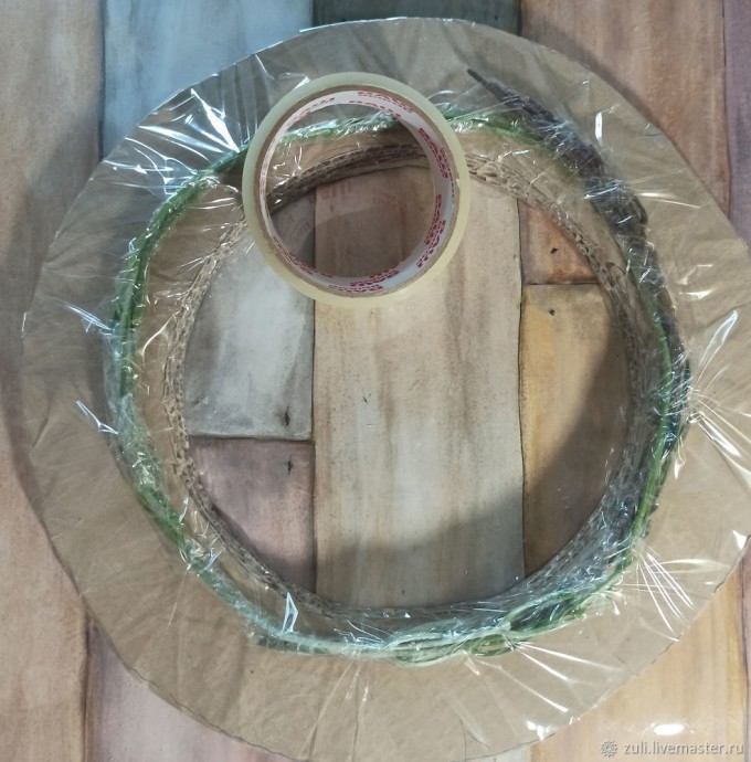 Чтобы венок получился «пухлым», ему необходимо задать объем. Для этого подойдет бумага, газета, упаковочная пленка. Нужно их смять и наложить на основу венка, примотать скотчем.